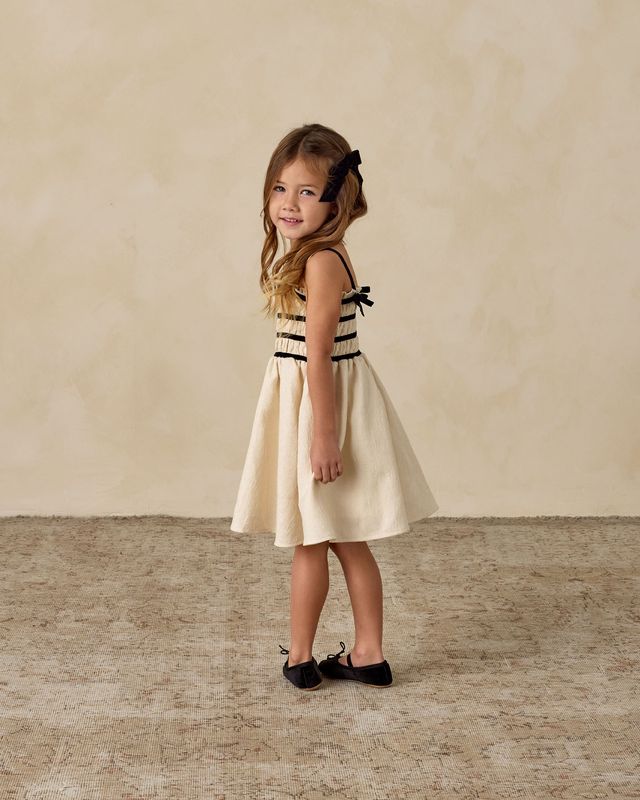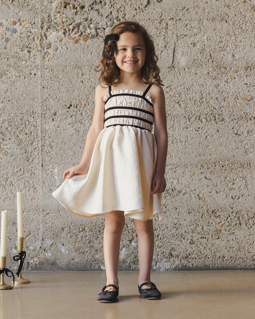 The Annabelle Dress features a smocked bodice with velvet trim, a delicate strap with a bow at the back and a full skirt in a beautifully textured jacquard. In shimmering metallic ivory, this dress is both classic and festive.