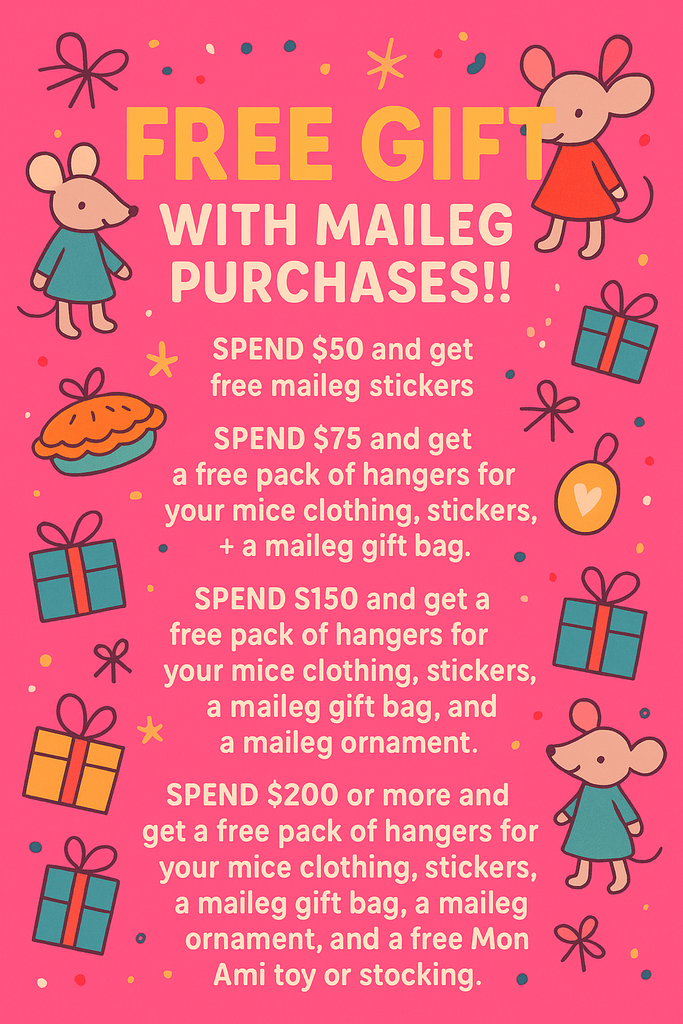 Spend $200 or more and get a free pack of hangers for your mice clothing, stickers, a maileg gift bag, a maileg ornament, and a free Mon Ami toy or stocking.