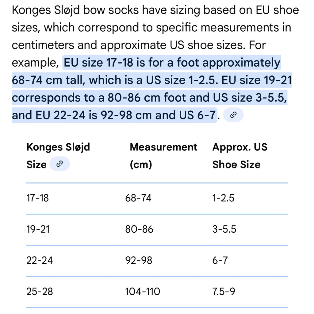Konges Sløjd bow socks have sizing based on EU shoe sizes, which correspond to specific measurements in centimeters and approximate US shoe sizes