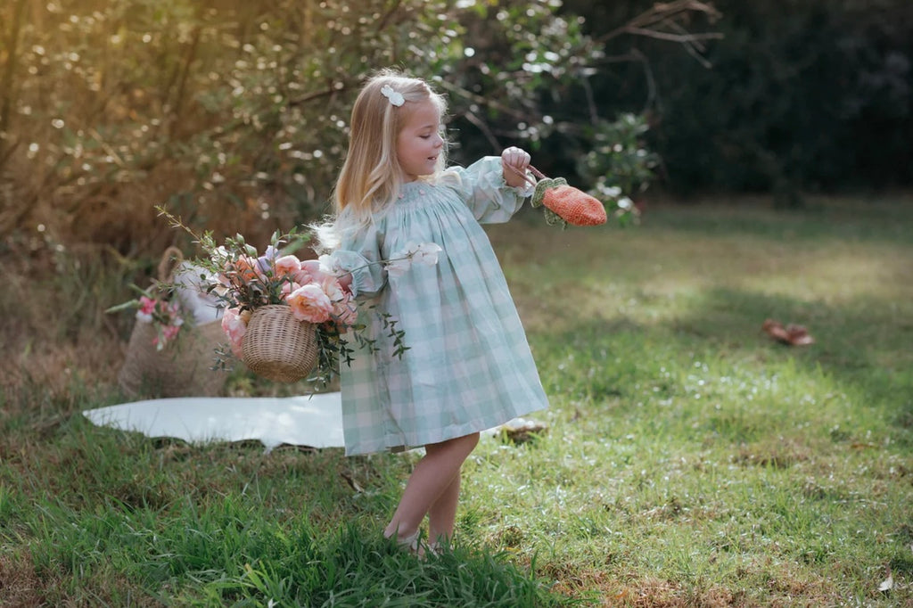 Delicate smocking around the neckline is beautifully adorned with hand-embroidered floral touches, showcasing the artistry and craftsmanship that make this piece truly one of a kind. Designed with ¾ sleeves, it’s a perfect balance of elegance and comfort—ideal for Easter gatherings, spring celebrations, and twirling through sunshine-filled days.
