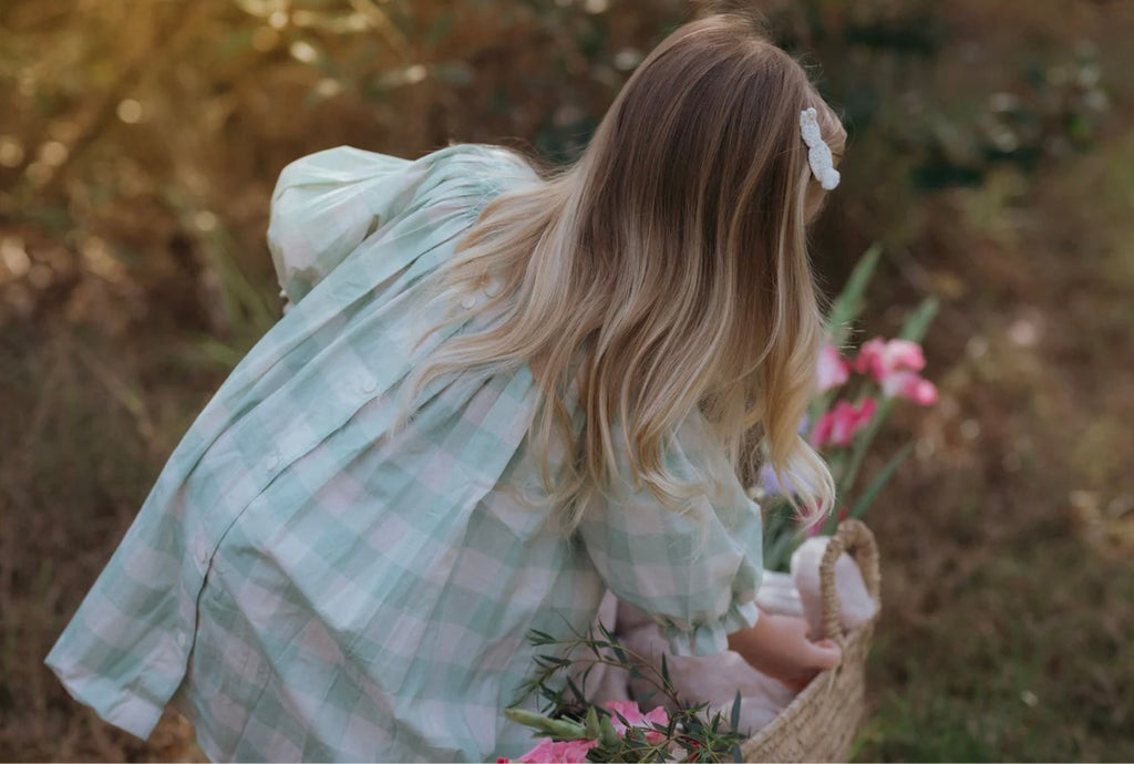 A timeless silhouette with the sweetest handcrafted details, the Bishop Dress is a true heirloom piece. Made from 100% Pima cotton gingham in a fresh spring green, it’s soft, breathable, and perfect for the season ahead.
