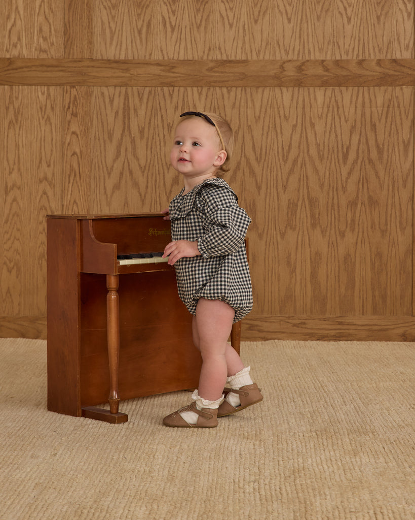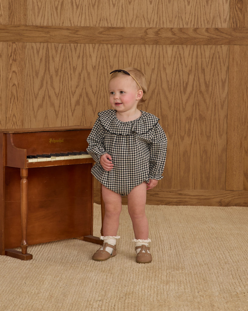 Our Colette Romper features a scalloped collar and gathered sleeves for a darling look, with bottom snaps for easy changes.Featuring our 'black gingham' print.Care: Machine wash cold. Lay flat to dry.Made of 100% cotton.