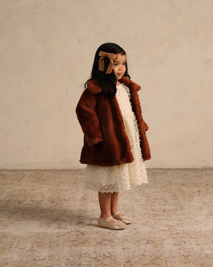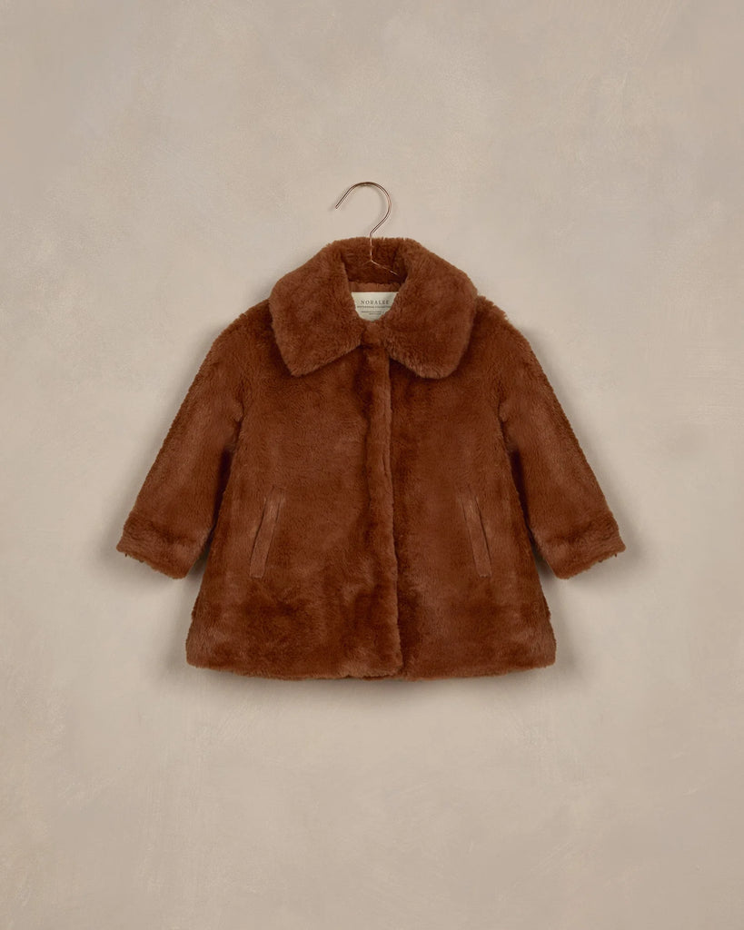Our new Eloise Coat has hidden snaps along the center front and pockets at the front. With a darling full collar, this slight oversized cut fuax fur coat will keep your little one warm this season.