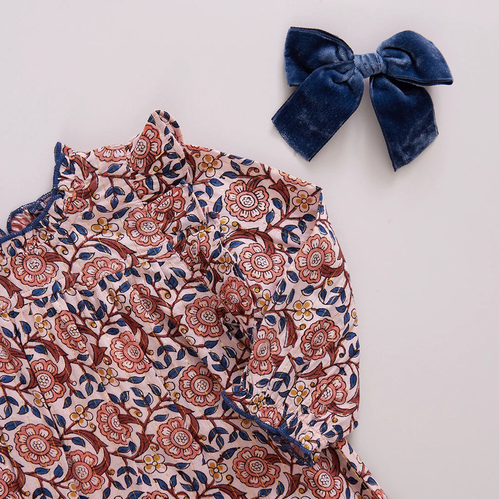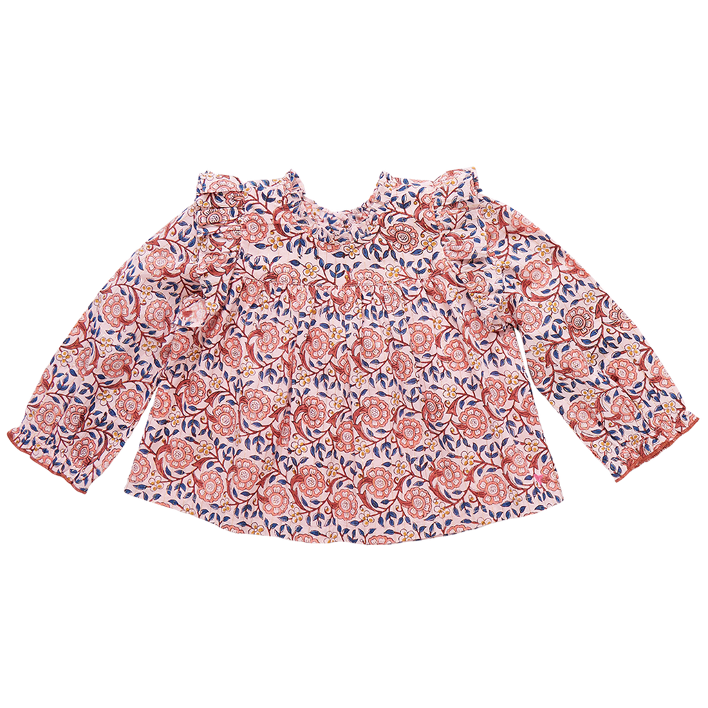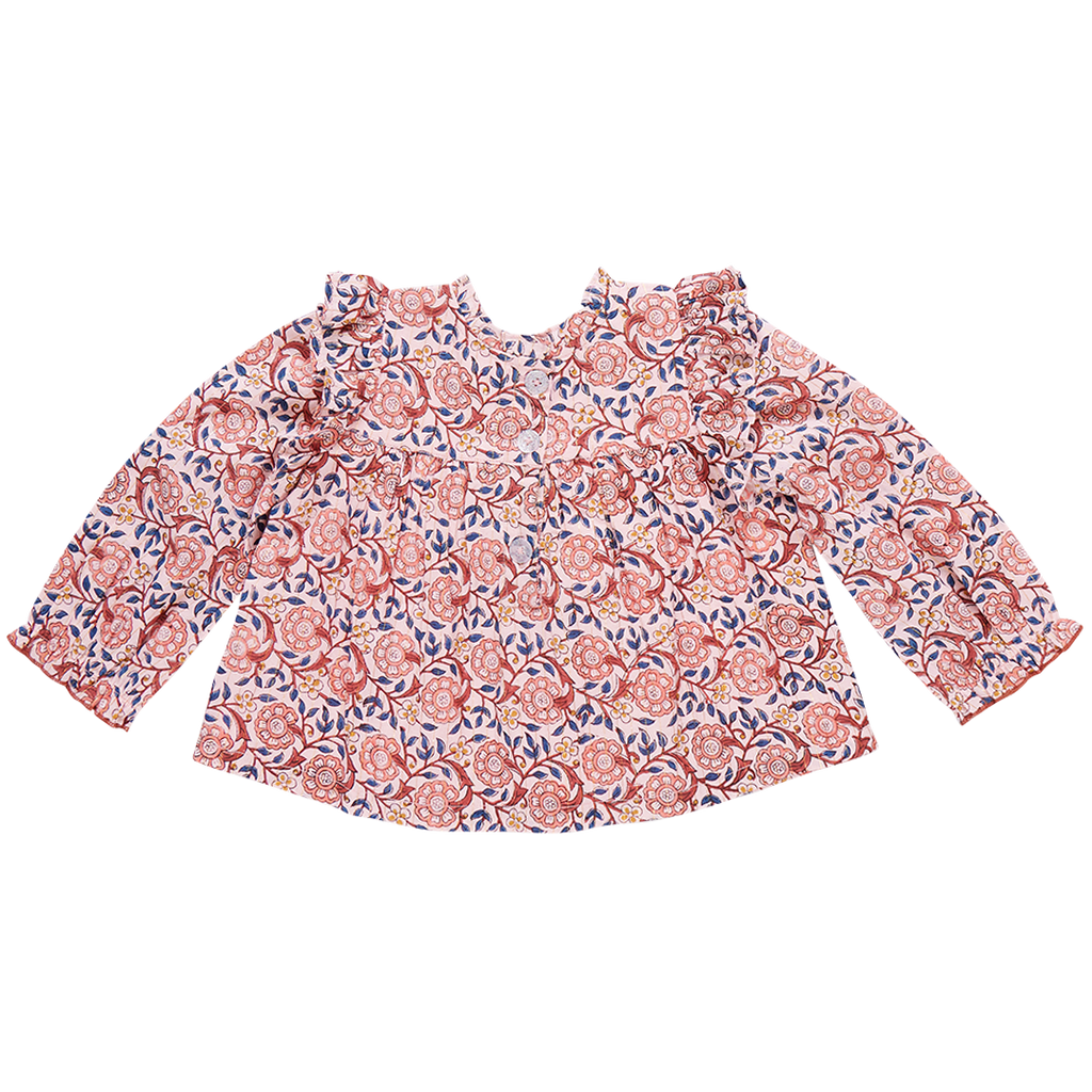 Garden Of Dreams! Blush blooms on a petal ground are tangled with blue leaves and coral vines in our richly colored Pink Blossom Block Print. This gorgeous floral, an interpretation of the traditional vintage block prints that we love so much, brings our Girls Kalani Top to life. Ruffles at the sleeve, shoulder and neck give this piece a nostalgic feel. A glitter button back closure and shimmery rose gold thread throughout adds some extra magic. Pair with our Girls Wylie Pant for a stylish ensemble.