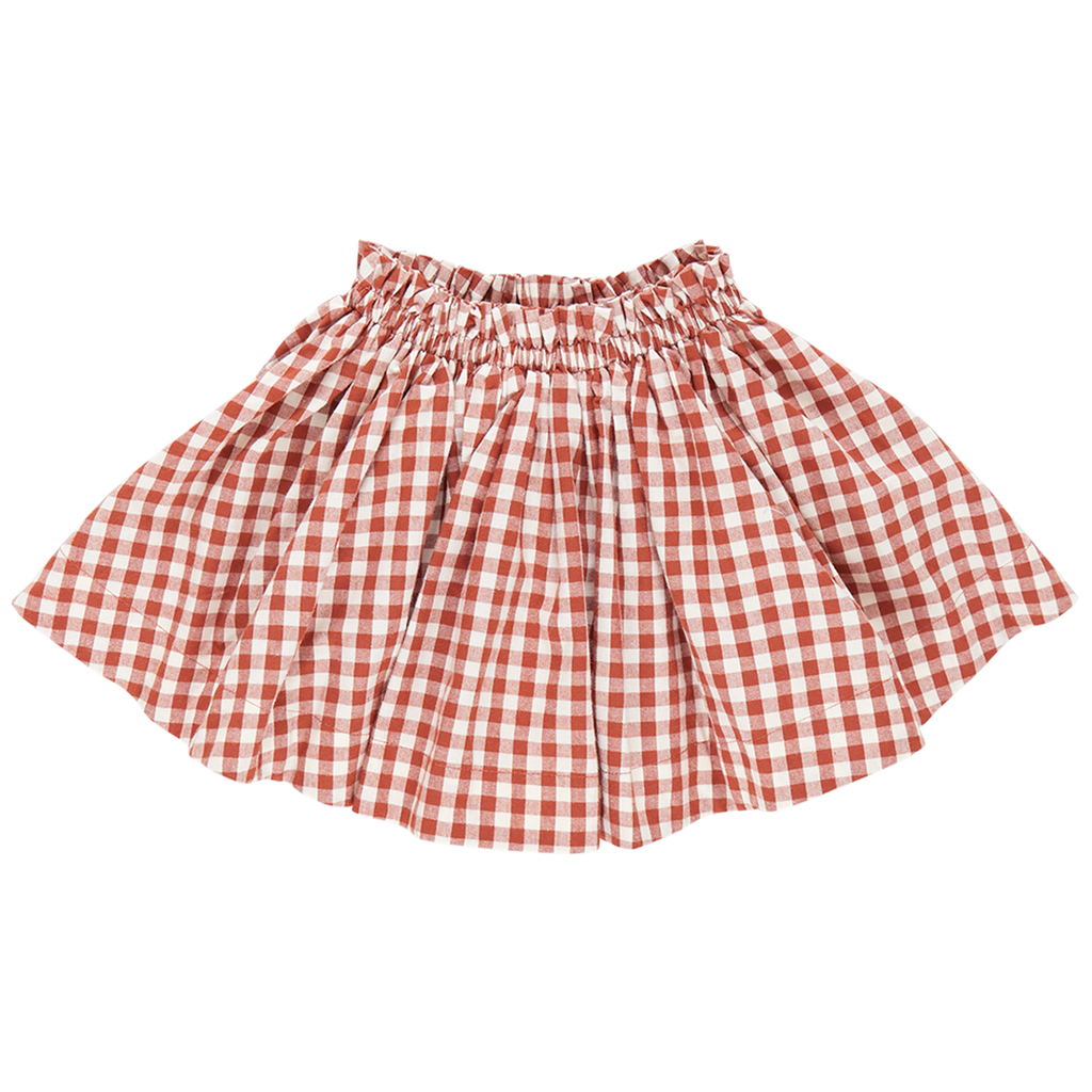 Going For Gingham! Rust and cream checks make up our ready for fun Girls Theodore Skirt shown here in Pony Gingham. This twirl-ready silhouette features an elastic ruffle waist and a full skirt. Wear with one of our organic tops and our Girls Cable Constance Sweater.
