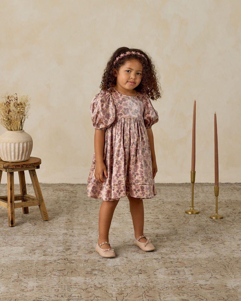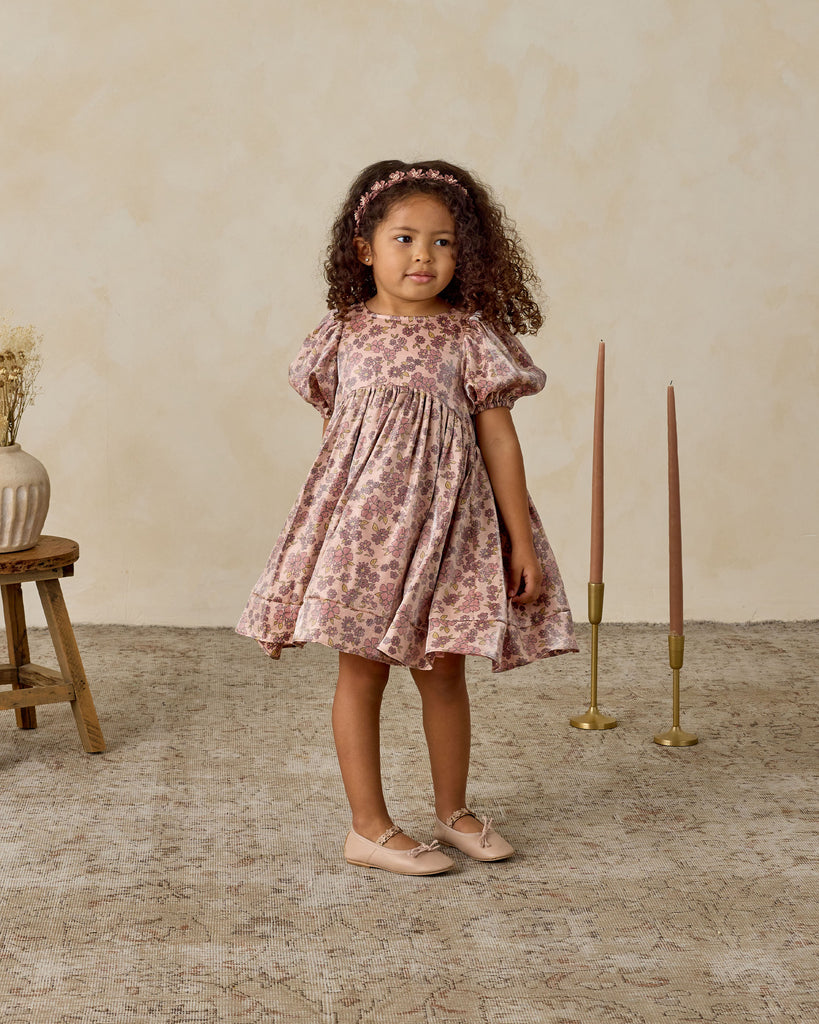 Our Luna Dress showcases a babydoll-inspired silhouette with sweet puff sleeves, a gently curved waistline, and two faux shell buttons at the back for a delicate finishing touch. Crafted from our metallic Tencel fabric, it adds a subtle shimmer perfect for special occasions. Coordinating bloomers included with size 2Y.