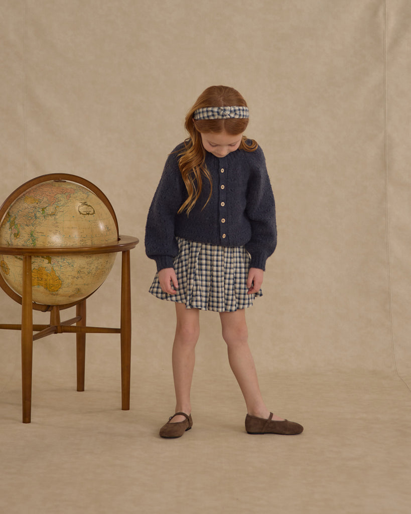 Our Pleated Mini Skirt features a side zipper and built-in shorts, so your little one can play all day in style and comfort.Featuring our 'navy check' pattern.Care: Machine wash cold. Lay flat to dry.Made of 55% linen / 45% viscose.