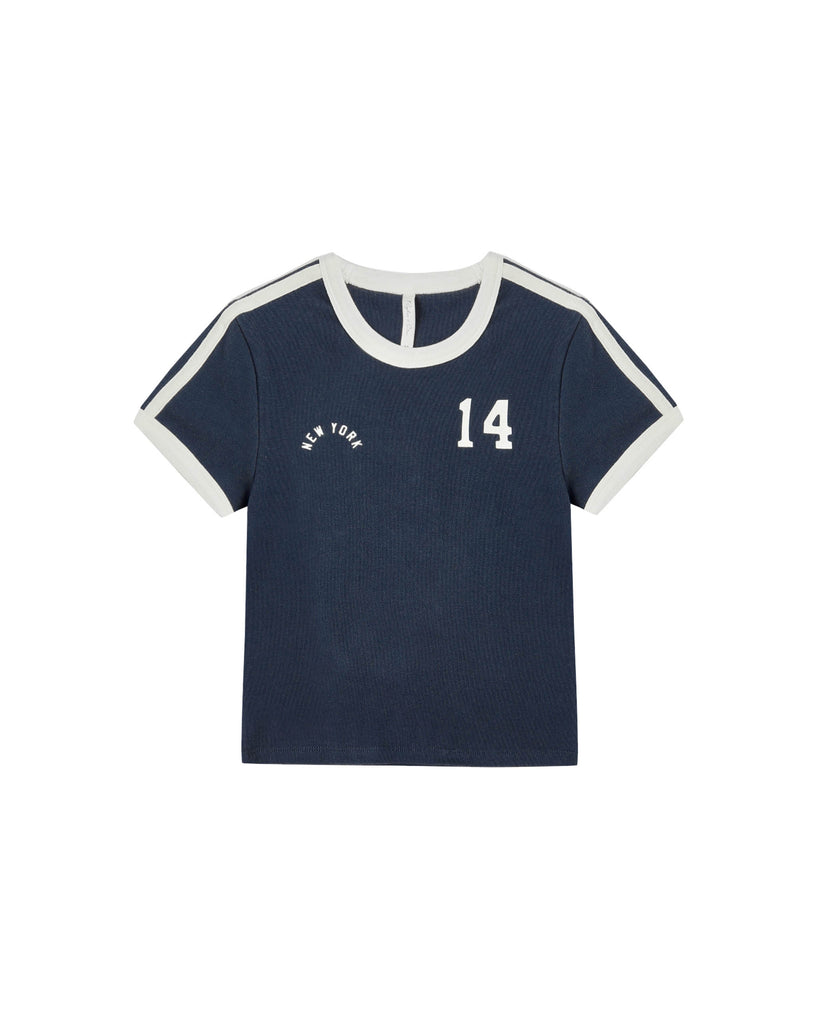 Baby Tee featuring contrast stripes at the neckline, shoulders, and sleeves for a sporty, standout look.