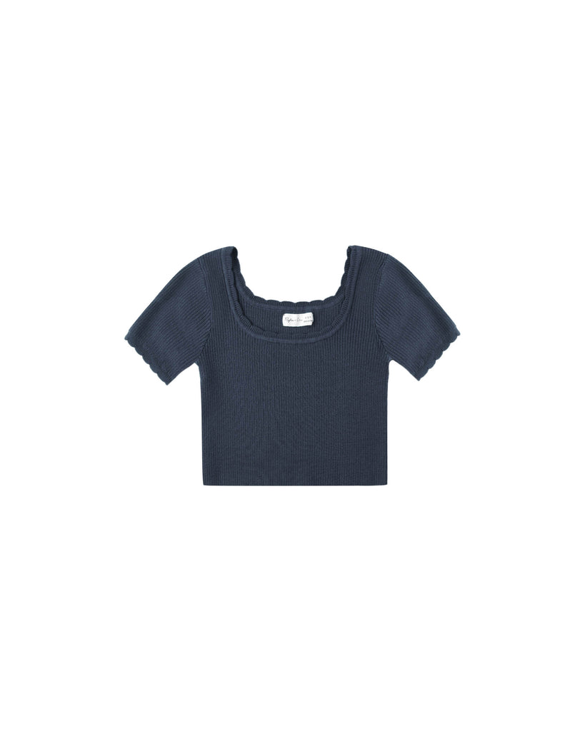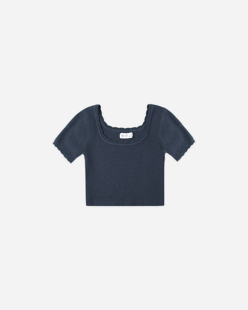 Our cropped-fit Scalloped Tee is a versatile fall staple, crafted from delicate pointelle knit fabric and detailed with scalloped sleeves and neckline.